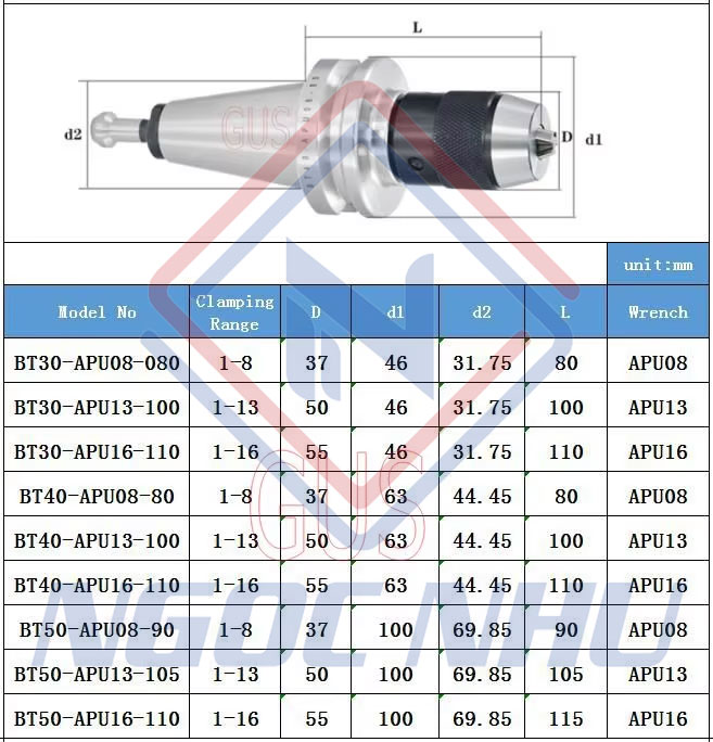 - Đầu khoan BT40-APU16 là loại đầu kẹp tự động không chìa tự định tâm, có hỗ trợ trợ cây xiết đầu khoan C16 cho phép kẹp mũi chắc chắn, đồng tâm, độ cơ động cao.